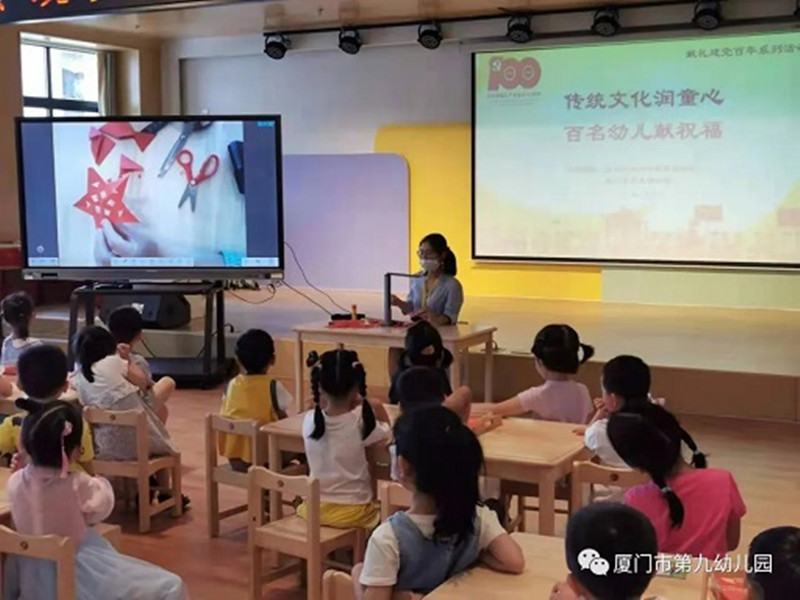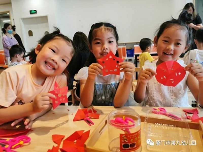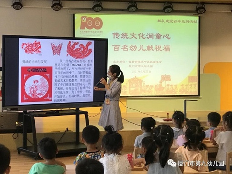 5月26日,厦门市第九幼儿园结合献礼建党百年系列活动,与梧村街道滨中社区居委会合作开展了“非遗剪纸文化进校园”活动,百名幼儿用百幅作品为建党百年献上祝福。