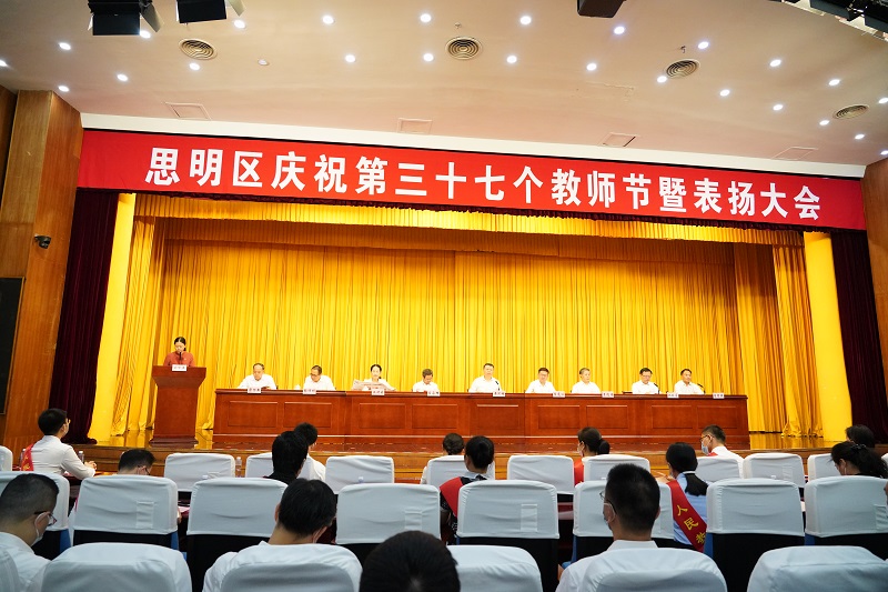 9月10日上午,思明区举行“庆祝第三十七个教师节暨表扬大会”,5名第三届“思明区杰出校长”、10名“思明区好教师”和10名综合奖代表在现场受表彰。思明区委书记黄河明,区委副书记、区政府代理区长陈通汕等领导现场为老师们授奖。