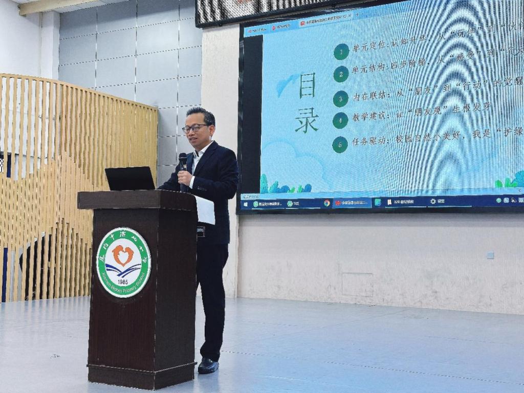 民立第二小学邱凯祥老师以《认知升华,从玩伴到伙伴》为题,从单元定位、结构分析到教学建议,层层深入进行阐释。他指出,本单元引导学生从“大自然真好看”的感性体验,走向“人与自然和谐共生”的理性认同,是一段从情感萌发到行动觉醒的成长之旅。
