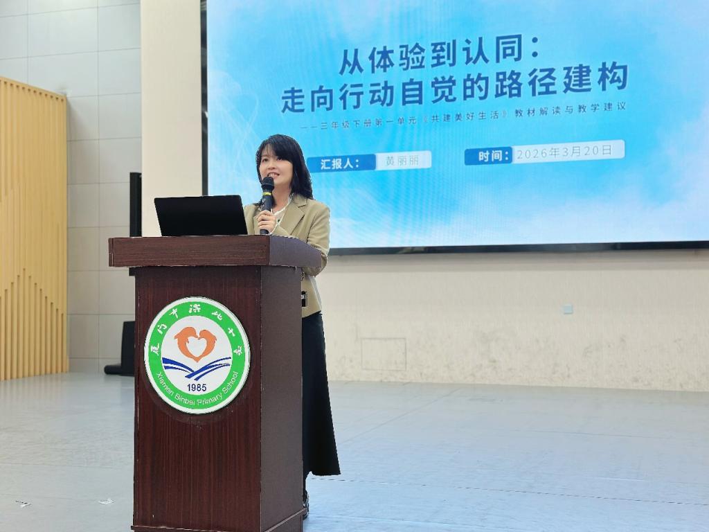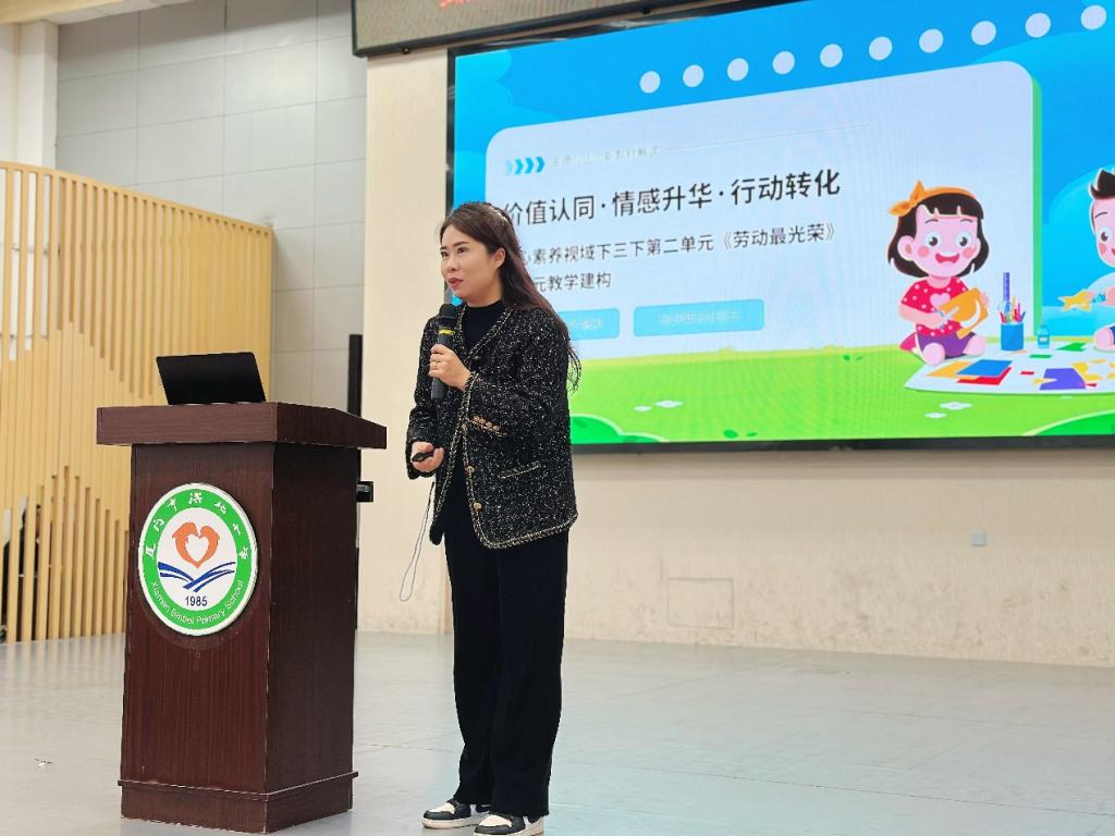 人民小学黄丽丽老师带来讲座《从体验到认同:走向行动自觉的路径建构》,聚焦三年级下册第一单元《共建美好生活》。她提出,教学中要为学生搭建从“感知唤醒”到“行动落地”的桥梁,让奋斗精神不再是宏大的口号,而是可触可感的故事与选择。