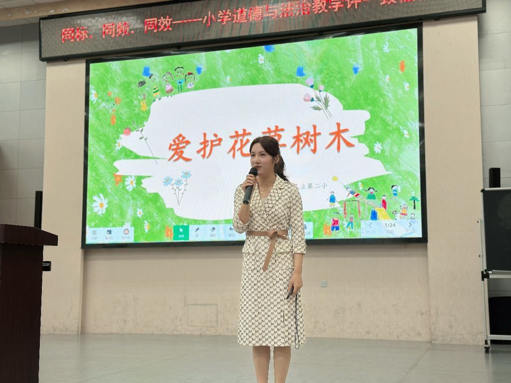 民立第二小学程小娟老师随后展示片段教学《爱护动植物》,以校园为课堂,借助AI智能体“绿向导”带领学生探秘草木、设计提示牌,将爱护自然与自我保护巧妙融合,课堂如春风化雨,润物无声。