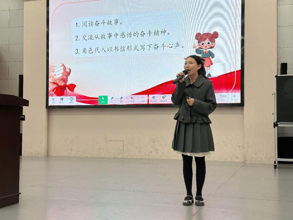 人民小学郑晓勤老师随后呈现片段教学《奋斗精神薪火相传》,通过绘本共读、时空对话、思辨信箱等形式,引导学生与历史对话、与自我对话,在书写“奋斗时间胶囊”中,悄然种下接续奋斗的种子。