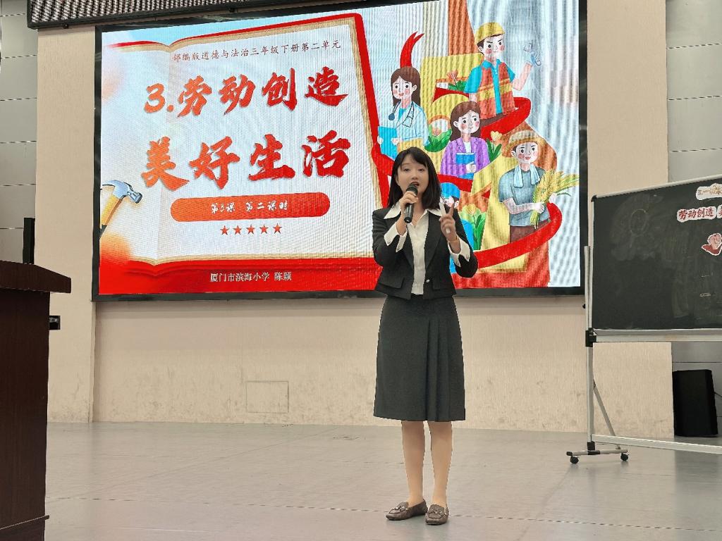 随后,滨海小学陈颖老师带来片段教学《劳动创造美好生活》,以“劳动时光机”为情境,带领学生探访丰收田野、智慧工厂、温馨服务区,在体验中感悟劳动之真、创造之美。