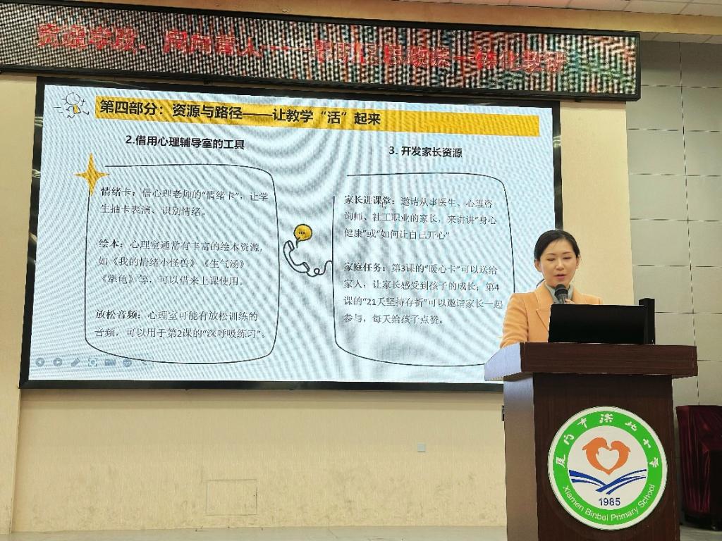 大同小学的殷海雯老师以《做孩子心灵世界的“点灯人”》为题,围绕单元逻辑结构、素养导向目标、教学策略及常见误区展开讲座。她提出,二年级下册第二单元的核心在于帮助学生“看见情绪—调节情绪—传递情绪价值”,并形象地以“乐观小屋”比喻单元结构,引导教师在教学中建立清晰的育人逻辑。