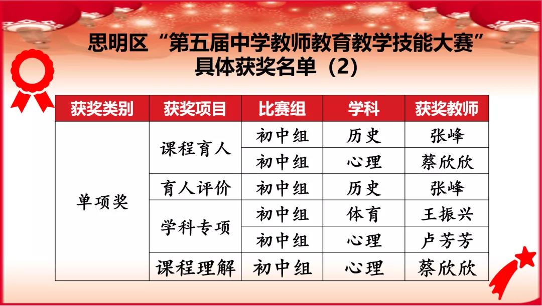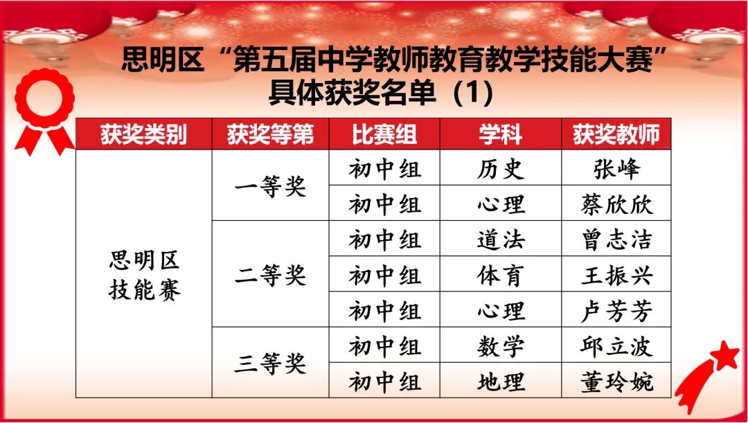 经过校级岗位练兵锻炼与选拔后,我校共推选23名校级代表参加区级教学技能大赛中,其中张峰老师、蔡欣欣老师荣获思明区技能赛一等奖,曾志洁老师、王振兴老师、卢芳芳老师、邱立波老师、董玲婉老师分获二、三等奖荣誉,7位老师还获得学科各项单项奖,我校也因此荣获“优秀组织奖”荣誉称号。具体获奖情况如下:
