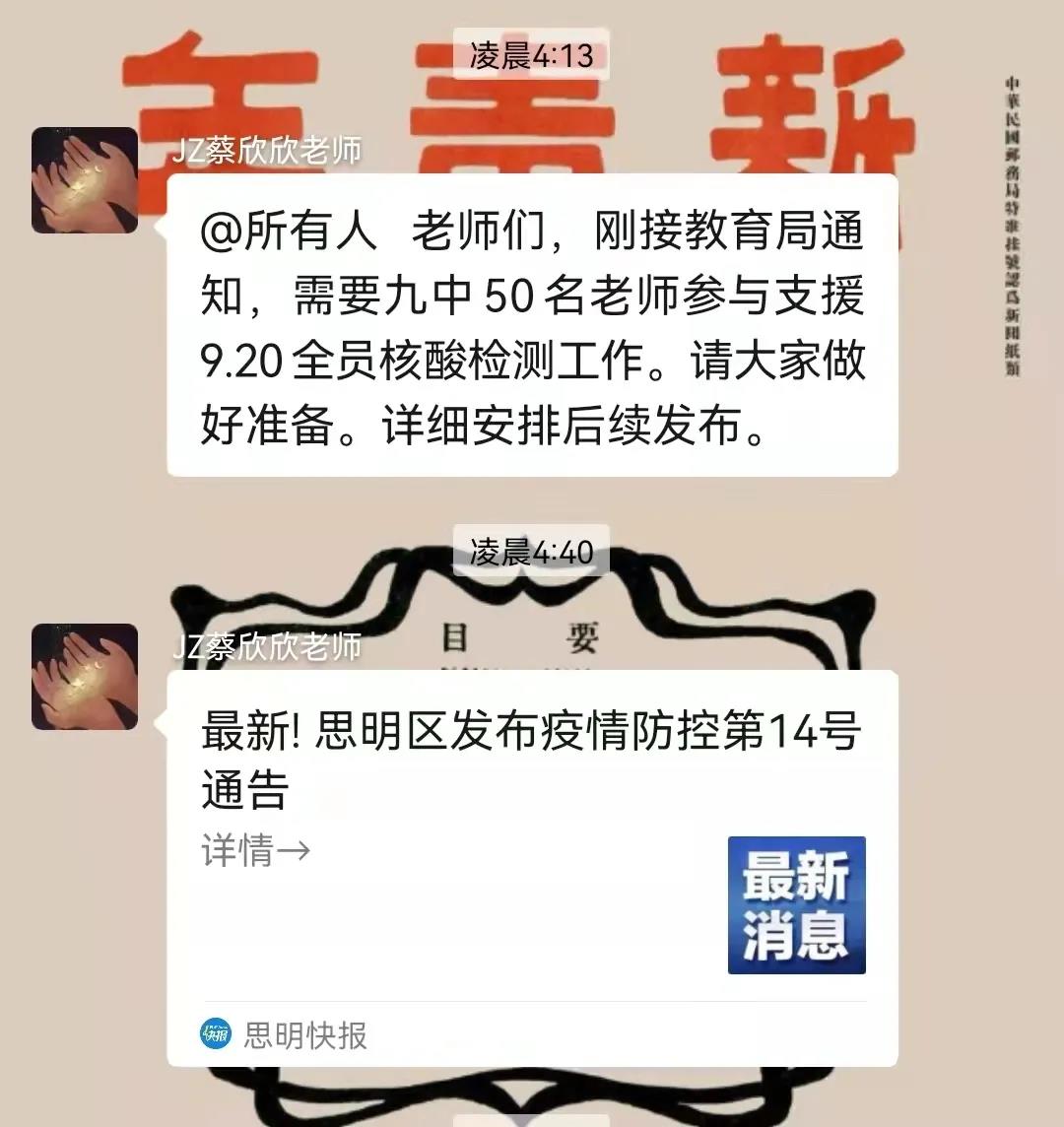 9月20日凌晨4点,学校办公室接到紧急通知,当日九中需要组织50名教工志愿者投入支援第三轮核酸检测。校办迅速反应,分配人员、电话通知,在教工们的积极响应下,不到3个小时完成了人员部署工作。20日上午8点30分,第一批志愿者全部到位,换装上岗。