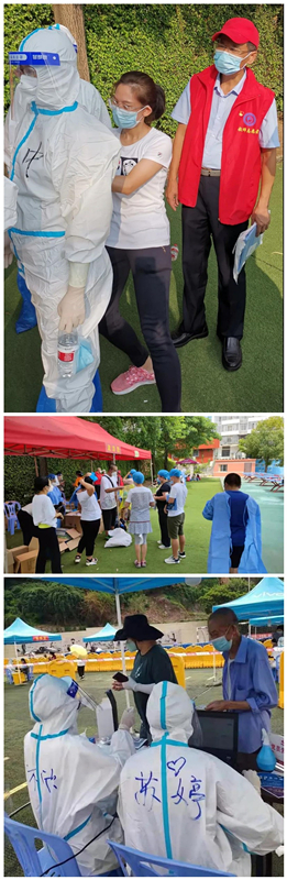 在人群中,我们看到了一个忙碌的身影——洪秋和校长。在两天的核酸检测工作中,他以身作则,全面协调,即使骄阳似火,即使汗流浃背,也要坚守在第一线,这是九中人的精神。洪校长正以这样的方式与九中的全体教师志愿者统一战线,并肩作战。