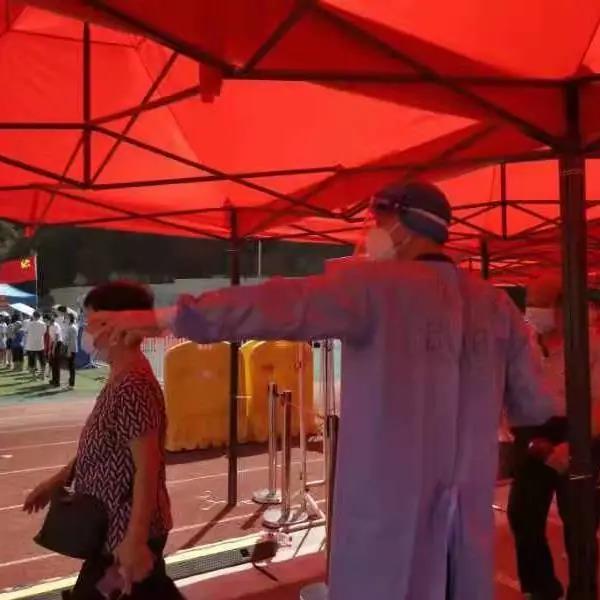 信息录入岗位上,教师志愿者们两人为一组,一人负责录入信息,一人负责引导说明,默契配合,高效工作。“请您出示登记码或者身份证”、“您拿好棉棒往左边走”,在他们的耐心引导下,换来了市民们的一声声“您辛苦了”、“谢谢您”——这对教工们来说无疑是赤日之下最好的回馈。我们也许无法看清在防护装备下的究竟是谁,但是他们有一个共同的名字——九中人。站上三尺讲台他们是诲人不倦的教师,穿上防护服他们就是抗疫一线的勇敢战士