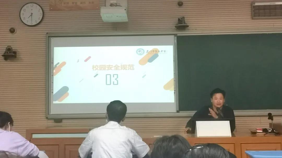 德育处副主任、保卫科科长吴少杰老师重点结合校园安全教育工作中的具体案例,以“预防、处理、关注、第一时间”四个关键词对校园安全教育工作重要环节进行梳理,强调了防疫、防恐大背景下校园安全规范事宜,牢固树立“安全第一”的思想。