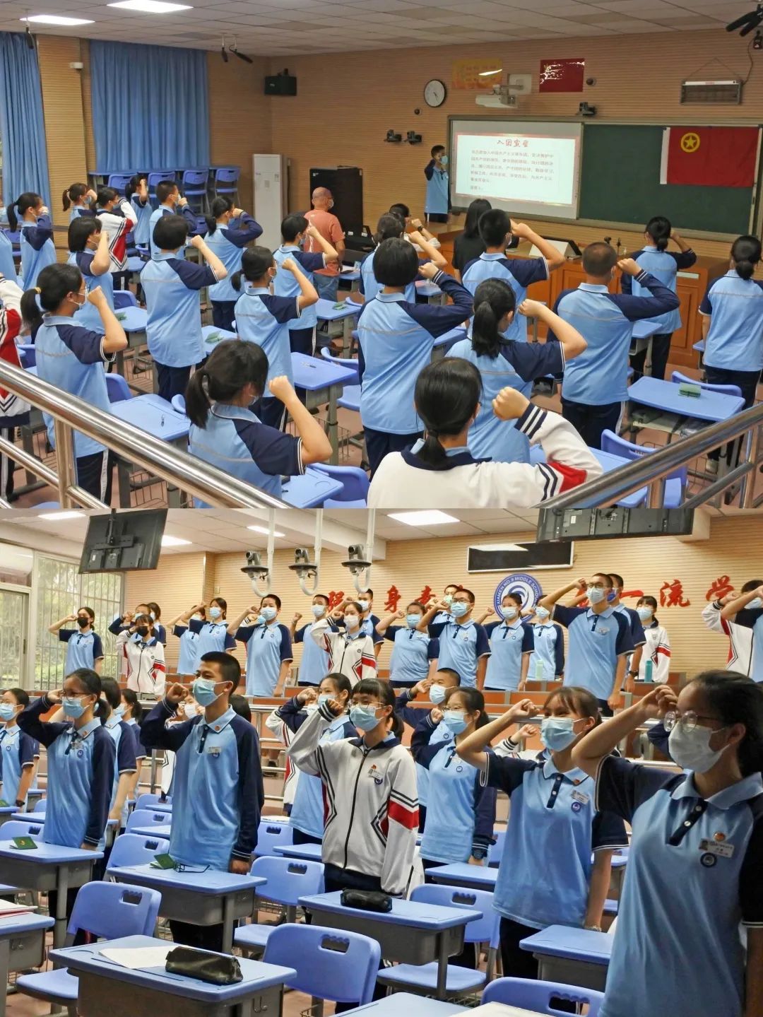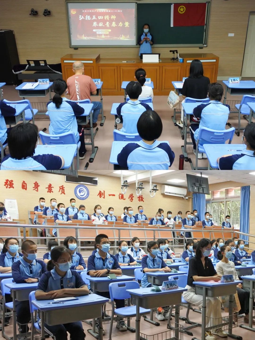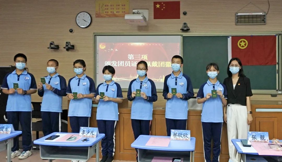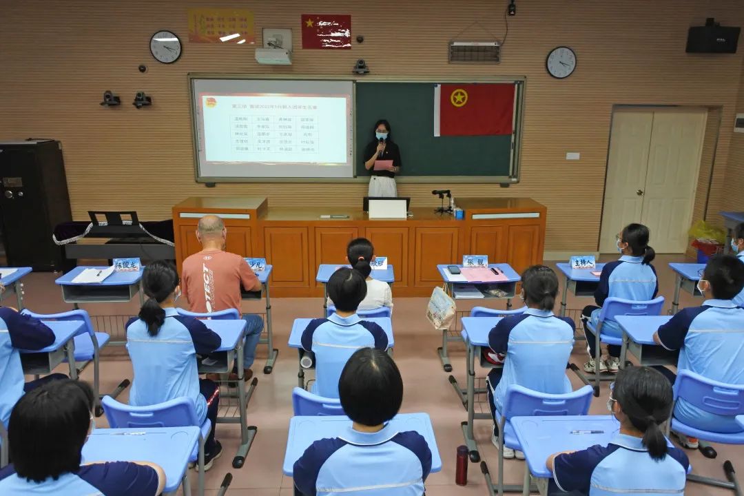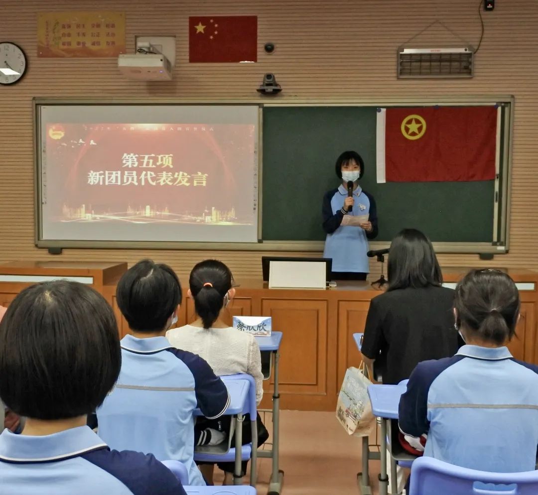 回望百年,共青团引领无数青年担当使命,谱写了一曲曲壮丽的青春之歌。今年是中国共产主义青年团成立100周年,为迎接党的二十大胜利召开,践行“请党放心、强国有我”的青春誓言,5月9日,我校在勤奋楼录播室举行“弘扬五四精神 奉献青春力量”纪念中国共青团成立100周主题团日活动暨2020级新团员入团宣誓仪式。校长助理兼办公室主任蔡欣欣;校党总支青年委员兼统战委员李少凡;校团委书记、少先队辅导员张靓;初二年段长陈俊龙出席本次仪式,初二10班林涵颖主持本次仪式。