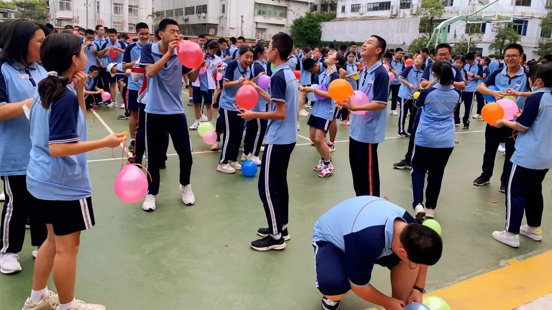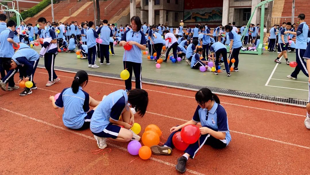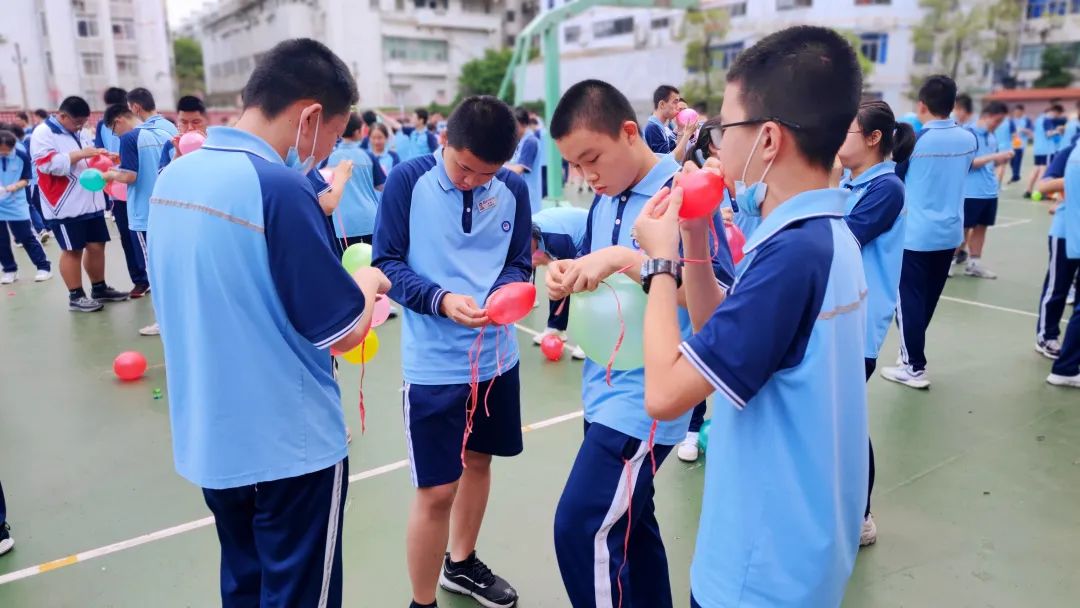 当听到郑老师宣布拓训的主体活动为“气球大战”时,全场沸腾了,同学们兴奋地找到班委领取物料——4只气球、一段塑料绳,依照准备要求、各自不顾形象地吹起气球来,仿佛要将备考以来的压力、烦恼统统吹进去一般。