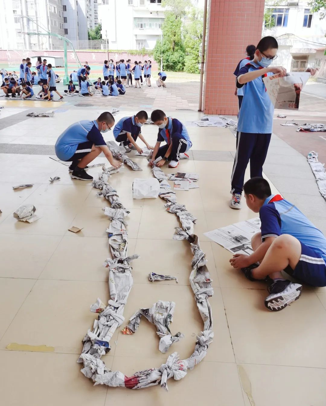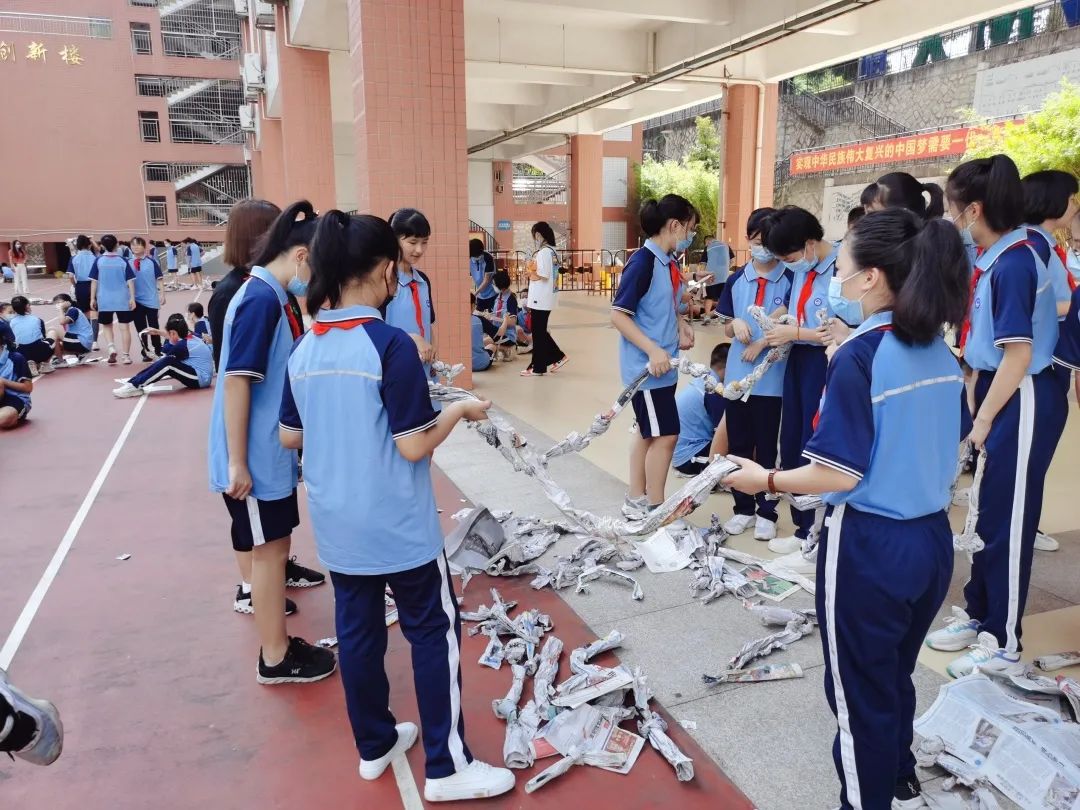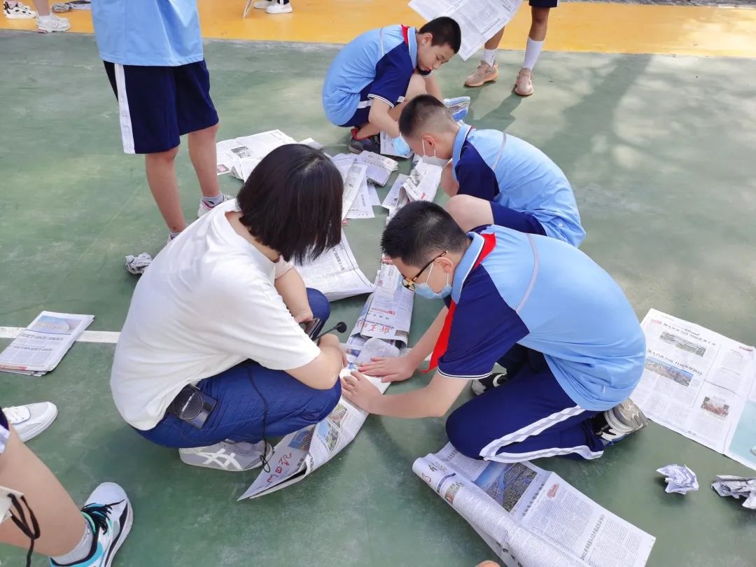 “履带战车”游戏,每个班级在“桃花朵朵开”后分成4组,每组学生需在25分钟内将自带的报纸制作成一个可以容纳全组成员的封闭式大履带。