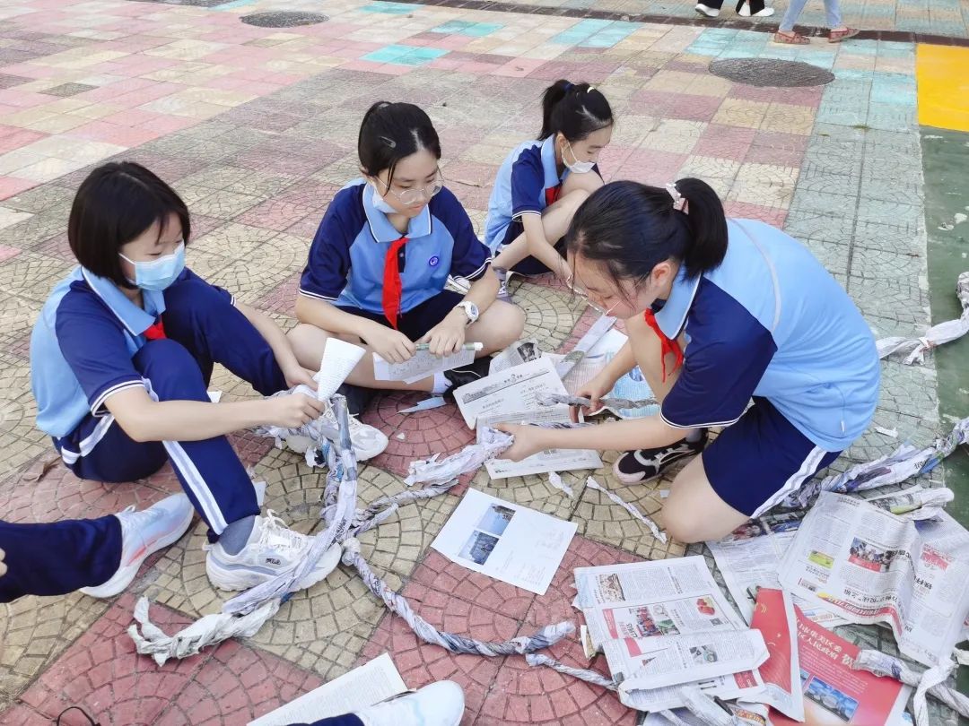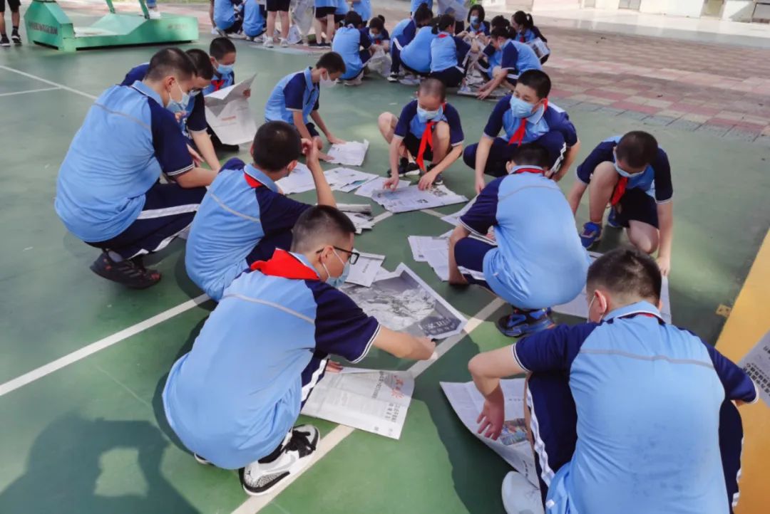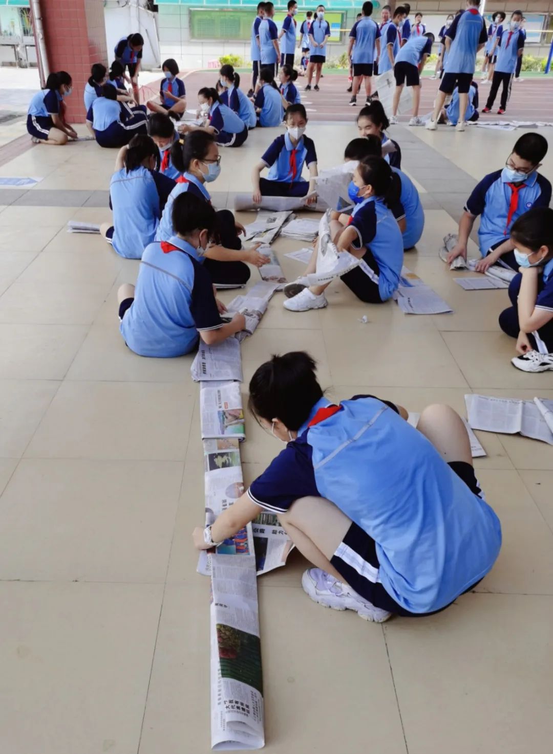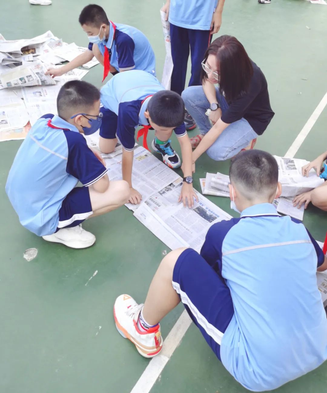 “履带战车”游戏,每个班级在“桃花朵朵开”后分成4组,每组学生需在25分钟内将自带的报纸制作成一个可以容纳全组成员的封闭式大履带。