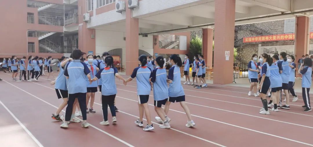 “桃花朵朵开”游戏,各班同学分别围成一个圈,一边顺时针慢跑、一边拍掌。当班主任说:“桃花桃花朵朵开!”时,同学们一起问:“桃花桃花开几朵?”,当老师说:“桃花开n朵”时,大家就要按照老师回答的数字“n”迅速抱团。该活动简单有趣,同学们在愉快的笑声中加强了凝聚精神。