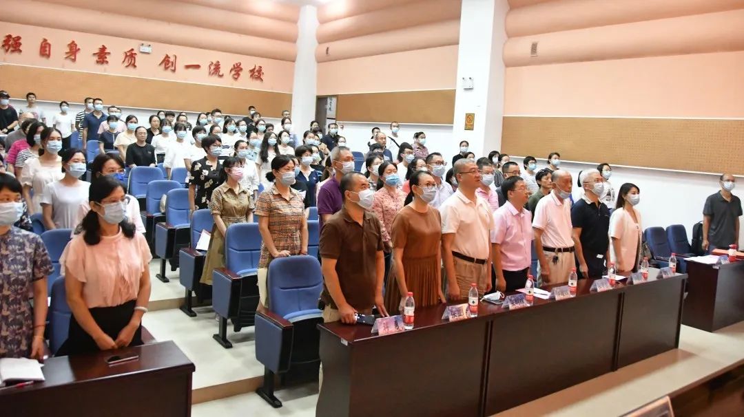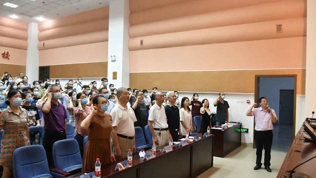 巍巍师魂千秋颂,铮铮誓言万世传。在许耀辉校长的领誓下,全体教工举起右拳庄严宣誓——“我是一名光荣的人民教师,我将牢记党的教育方针,不忘立德树人初心,牢记为党育人、为国育才使命,践行社会主义核心价值观,严格遵守《教师职业道德规范》,积极探索新时代教育教学方法,不断提高教书育人本领,争做“四有”好老师,努力培养德智体美劳全面发展的社会主义建设者和接班人,为人民教育事业和实现中华民族伟大复兴的中国梦而不懈奋斗。”