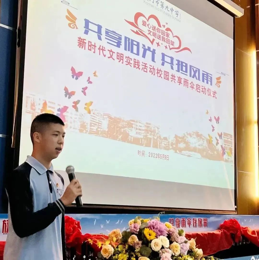5月9日,“共享阳光,共担风雨”新时代文明实践活动校园共享雨伞启动仪式在九中举行。共享雨伞的启动,不仅仅方便学校师生,为大家挡风遮雨,更是校园诚信文明的流动标签,对和谐校园建设起着积极的促进作用。