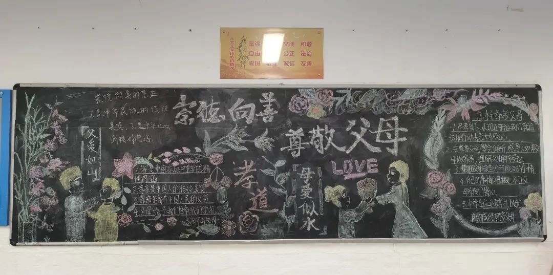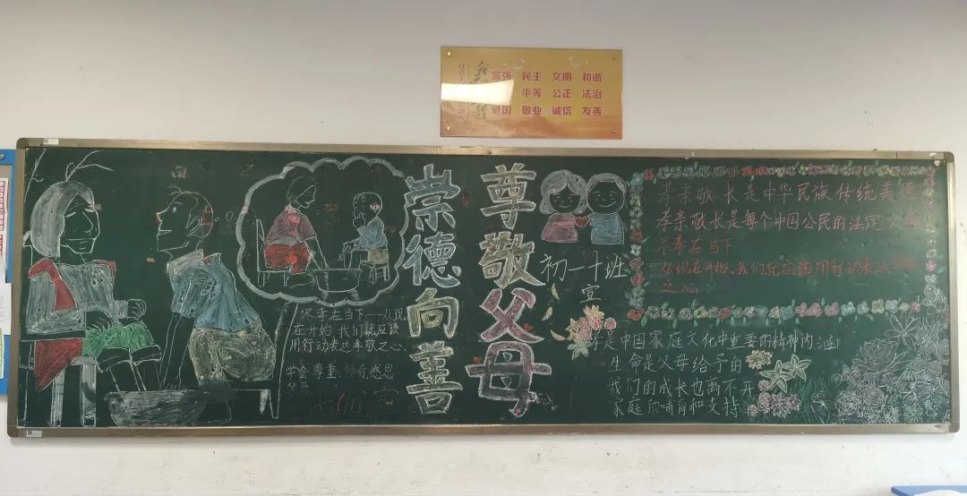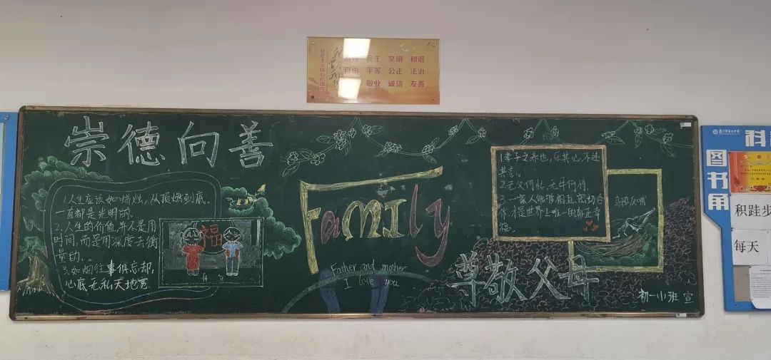 1.为了更好地宣传活动主题,我校在初一年开展了以“崇德向善,尊敬父母”为主题的黑板报制作、评比活动,各班级积极参与,活动氛围浓厚,有力地宣传了“崇德向善,尊敬父母”的传统美德。