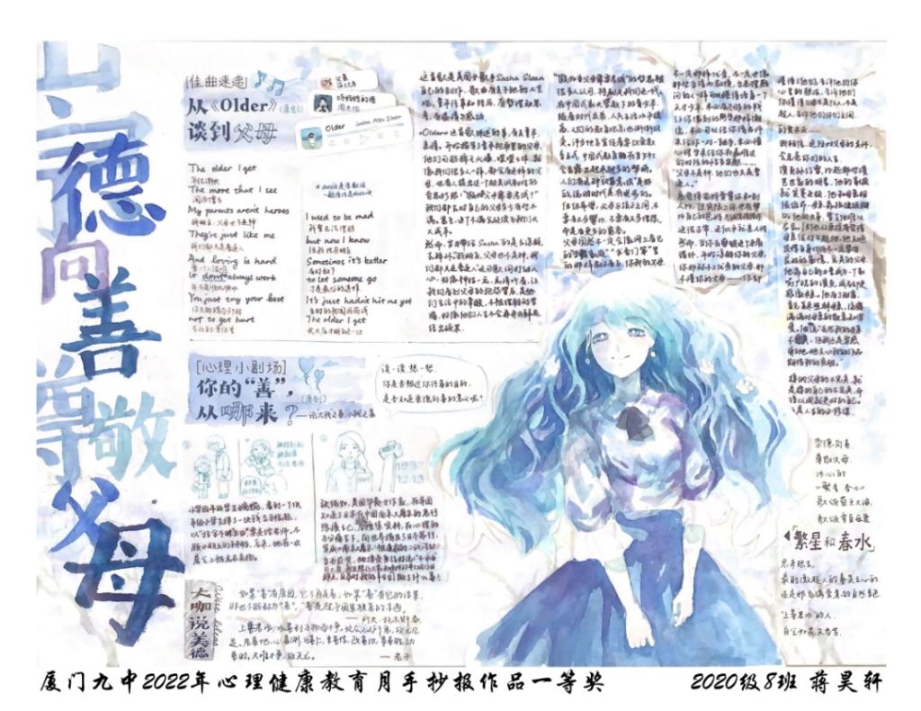3.“校园心理漫画”是九中一直延续开展的特色活动,今年的心理健康教育月依然组织同学们开展心理漫画及手抄报、心理健康招贴画展评活动,通过同学们的优秀作品,宣传普及心理学知识和心理保健常识、分享成长感悟、宣泄内心压力、传递正能量、我手画我心。