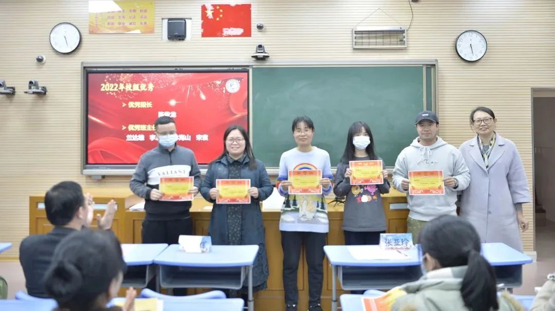 随后,九中党总支书记、校长许耀辉宣读了《厦门市第九中学关于2021—2022学年度校级各类先进的表彰决定》。获得各个奖项荣誉称号的教工们先后上台领奖,许耀辉校长、张亚玲副校长及邱东华协理员先后为获奖教工颁发了奖状,并与他们合影留念。
