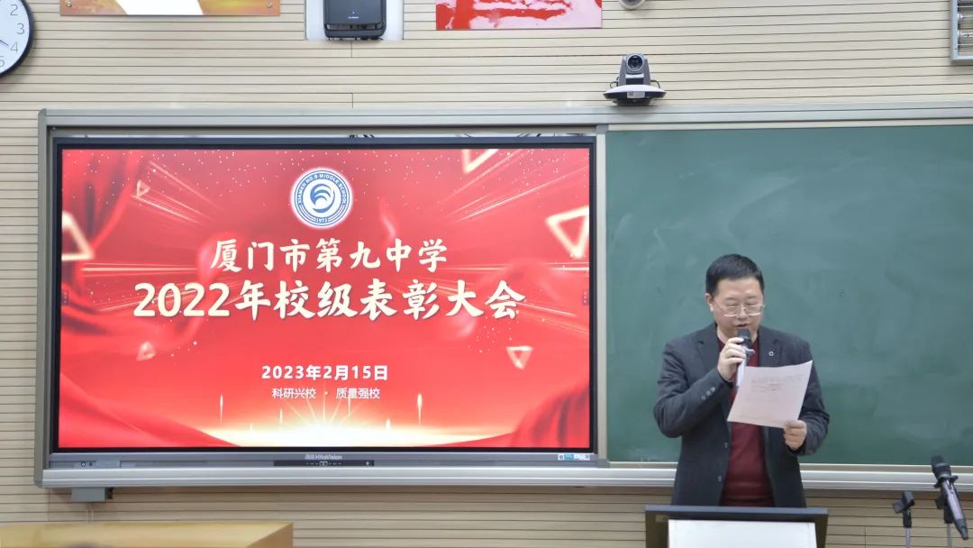 为表彰先进、树立典型,激励全校教职工以满腔热情投入新一年的工作中,2月15日,厦门市第九中学全体教职工齐聚一堂,举行了简朴而隆重的2022年校级表彰大会。会议由办公室主任蔡欣欣主持。