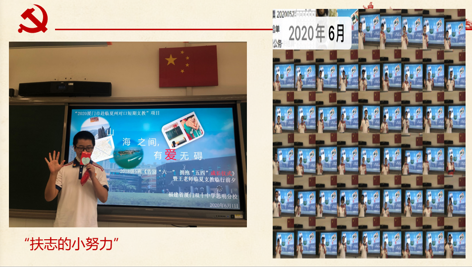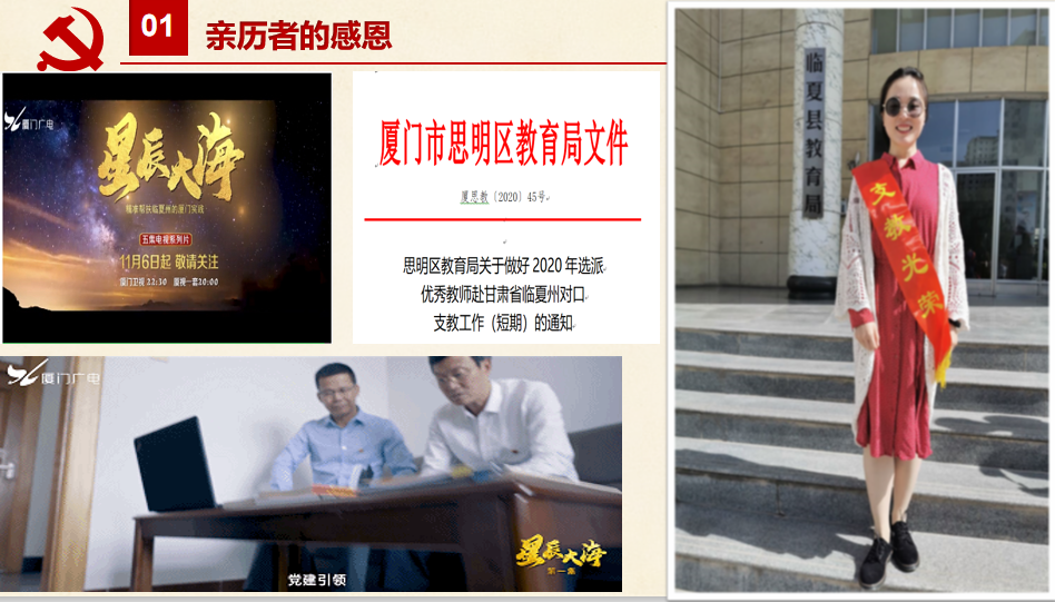 习近平总书记曾说,青春之花应开在祖国最需要的地方。2020年11月8日,在“讲好新思想、育时代新人”——厦门市青年思政课教师理论微宣讲比赛中,我校道德与法治学科王丽薇老师在众多选手的激烈角逐中脱颖而出,获得了第一名的好成绩。2020年11月18日下午,王丽薇老师通过自身赴甘肃临夏支教的经历,向我校全体党员开展专题党课《感恩·感触·感召》。