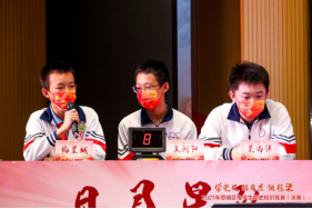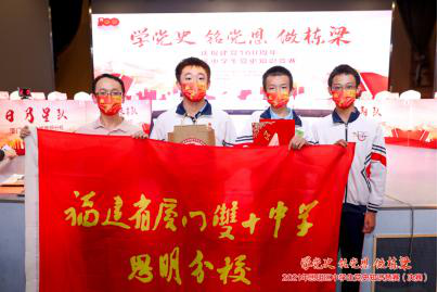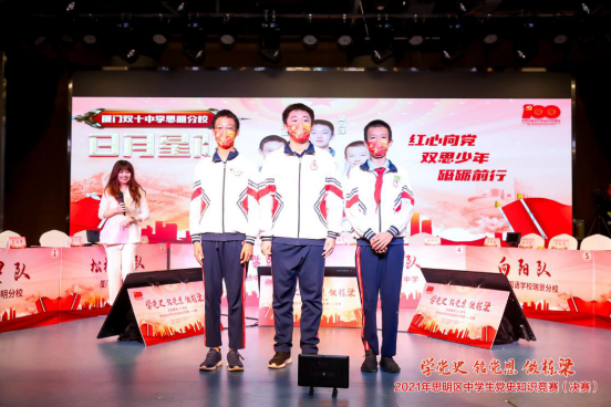 为庆祝建党100周年,思明区委文明办和思明区教育局联合主办“学党史,铭党恩,做栋梁”的中学生党史知识竞赛活动。双十中学思明分校选派初二(2)班杨昱城、初三(1)班王浏阳和初三(9)班吴尚洋同学组成“日月星队”参加此次活动。