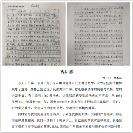 我们采用了线上和线下学习相结合的方式,让宪法走进课堂,融入活动,深入人心。道法课和品社课堂为学生打开了另一扇法治窗口,宣传了宪法基本原则、主要内容,培育青少年学生的宪法意识、国家意识、规则意识。同时,同学们积极参加第五届全国学生“学宪法 讲宪法”网上学习和“宪法小卫士”行动计划,进一步提高了学习教育广覆盖、见实效。