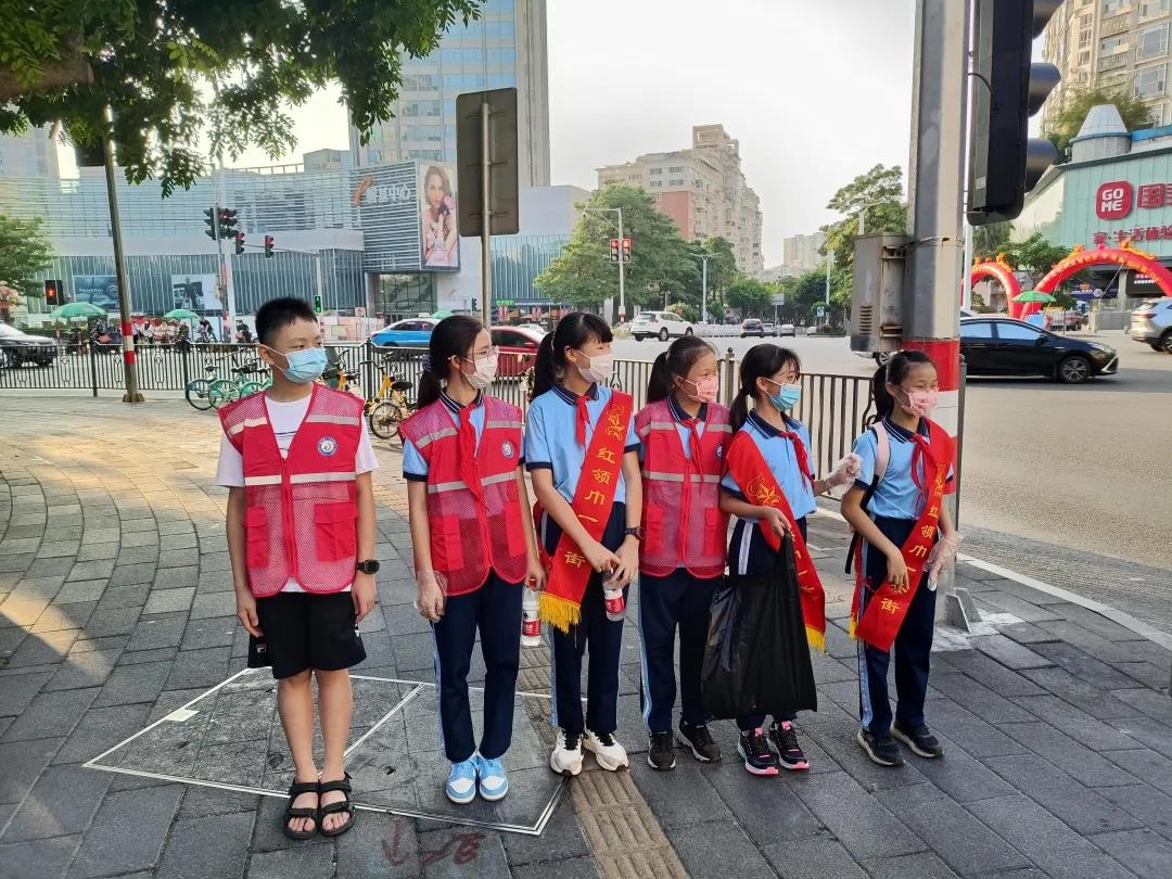 11月6日的下午,阳光格外明媚,学校门前的街道再次被“红领巾”的热情和汗水点亮。在班主任的带领下,他们有的身穿志愿者红马甲,有的身披“红领巾一条街”绶带,提着垃圾袋,一路昂首挺胸朝着莲花路口进发。
