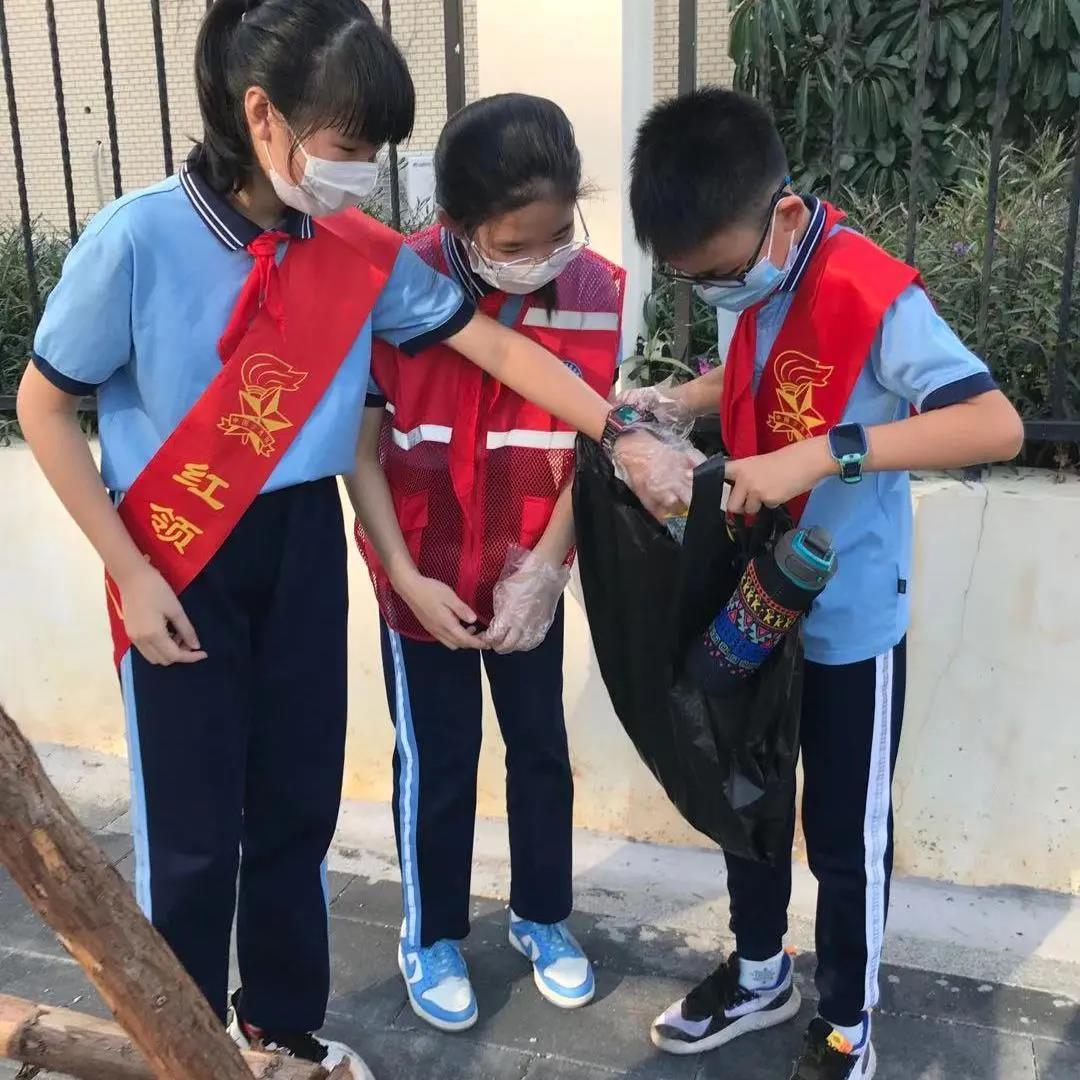 “红领巾”小队的同学们沿路对地面展开“扫荡式” 的搜索,地砖缝中的烟头、灌木丛中的水瓶,还有被随意丢弃的口罩都逃不过同学们的火眼金睛。