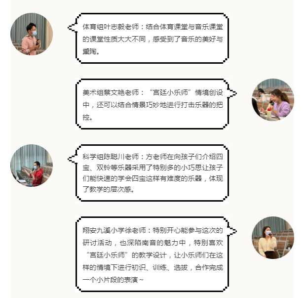 今天“四轮联动”(音乐专场)的研讨活动不仅让孩子们“沉浸式”体验在宫廷乐师情境中,也让老师们感受我国传统艺术的魅力,更增进了大家对中华民族传统文化的自豪感。戏曲是中华民族的根,教师担负着传承的使命,要有认同感,自己喜爱才能引导学生去喜爱,在“体验式学习”中,优秀的传统艺术走进了孩子们的心田,孩子们通过了解、学习、喜爱,坚定文化自信,做一名宏中华之粹的小小传承者,让南音之韵响彻校园。