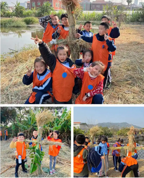 没有稻粒的稻杆是制作稻草人的材料。同学们用竹竿和绳子做好支架,把捆好的稻草一节一节的绑在竹竿上。不一会就做成了一个高大的稻草人。同学们发挥想象,有的用贝壳和胡萝卜做了眼睛和嘴巴;有的用花朵做了头饰,用树叶做了长裙,稻草人变得好玩又时尚。