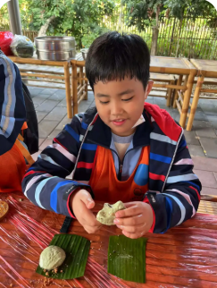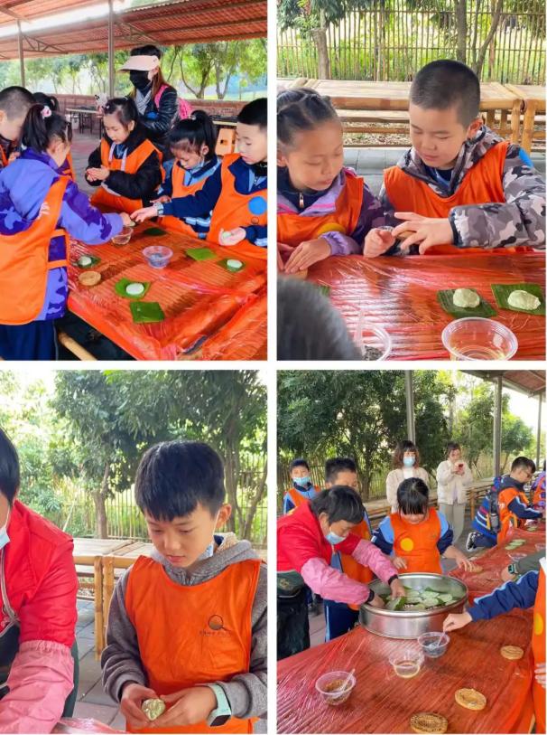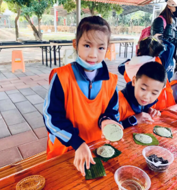 鼠曲粿是一种闽南传统的民俗食品。因是用鼠曲草做的,故叫鼠曲粿。在老师的指导下,同学们把小手粘上食用油,往米团里包入黑芝麻或者花生碎,揉搓成圆形,再把米团平铺在有图案的磨具上,稍用力下压,小心脱模后即可得到一个漂亮的粿子。同学们把煮熟的鼠曲粿带回家,开心的同爸爸妈妈分享自己亲手制作的食品。