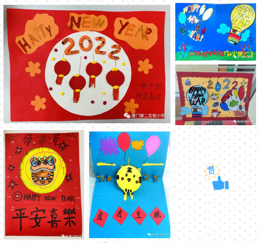 一年级小朋友发挥创意,制作了属于自己独一无二的英文新年祝福。