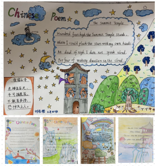 中国优美的诗词以娟秀工整的英文呈现,搭配精美的配图,三年级小朋友的作品洋溢着满满的笔墨馨香。