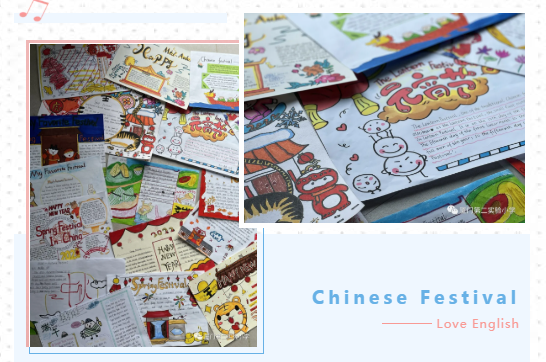 五年级的同学自制五彩缤纷的宣传海报,用英文介绍自己喜爱的中国传统节日。