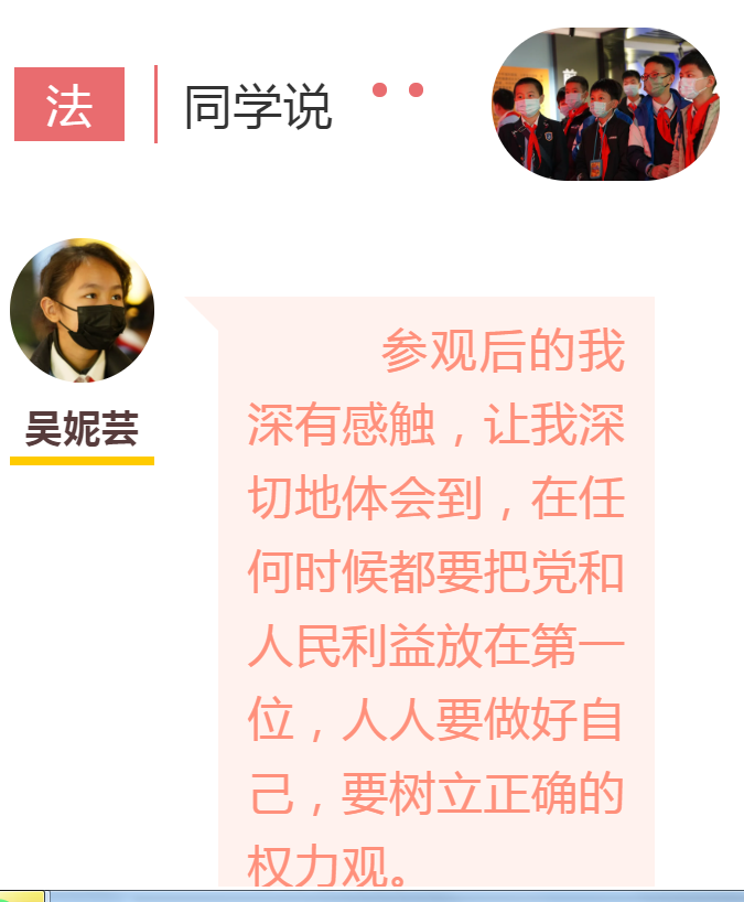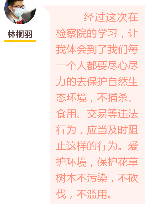 时间过得真快,当我们完成了所有项目,当法治树的灯一盏一盏亮起来的时候,好像一个又一个法治知识嵌入了我们脑中。检察官姐姐对我们说“护航青少年健康成长,检察机关从不缺席”,我们也想对阿姨说“有你们,我们觉得很安心,你们守护我们成长,我们也要守护身边绿水青山常在”。忽然想起了早上学校门口的使君子正抽出点点新绿,原来是法治的种子在我们心里悄悄萌芽。