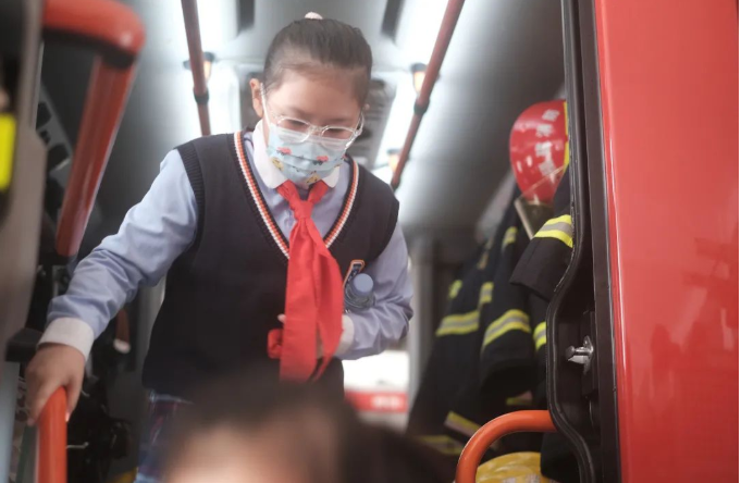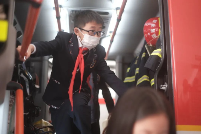 紧接着,在消防员叔叔的带领下,孩子们满怀激动地坐上威武庄重的消防车,更直观地了解消防车的内部构造,一阵阵欢呼声从消防车里传出。