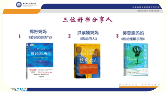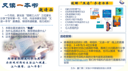 在校领导的大力支持与推动下,校核心家委团队在“新年第一书”家长阅读分享会之后,就开始启动“又读一本书”家长分享会的准备,并基于家长调查问卷中集中度最高的困惑,将本次分享会的主题聚焦于“焦虑”这个关键词,邀请家长朋友们利用2-3周的时间从所罗列的参考书单中选出一本进行分享。我们期待通过这“又读一本书”的开启来继续传递能量、助力成长,让家长朋友们在焦虑无孔不入的日子里有方向且有方法!