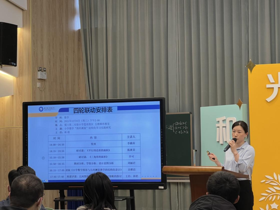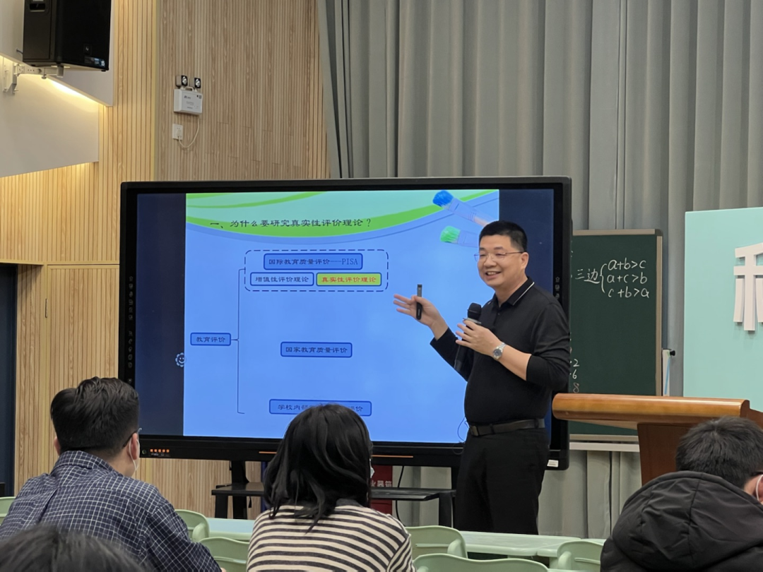 最后,思明区教师进修学校教研员吴伟华老师开展题为《基于真实性评价理论的数学学习评价》的专题讲座。围绕着“为什么要研究真实性评价?”、“什么是真实性评价?”、“以及PISA测评框架下对小学数学教学有何启示?”三个核心问题展开分享。