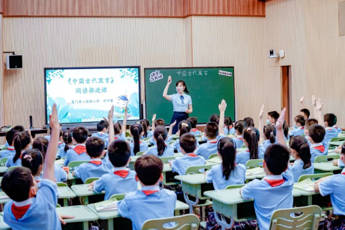 许可馨老师执教《中国古代寓言故事》整本书阅读推进课,创设开启寓言宝箱得金币的趣味情境,引领孩子们在书中畅游。