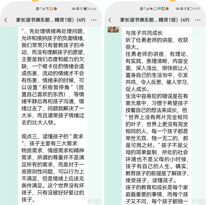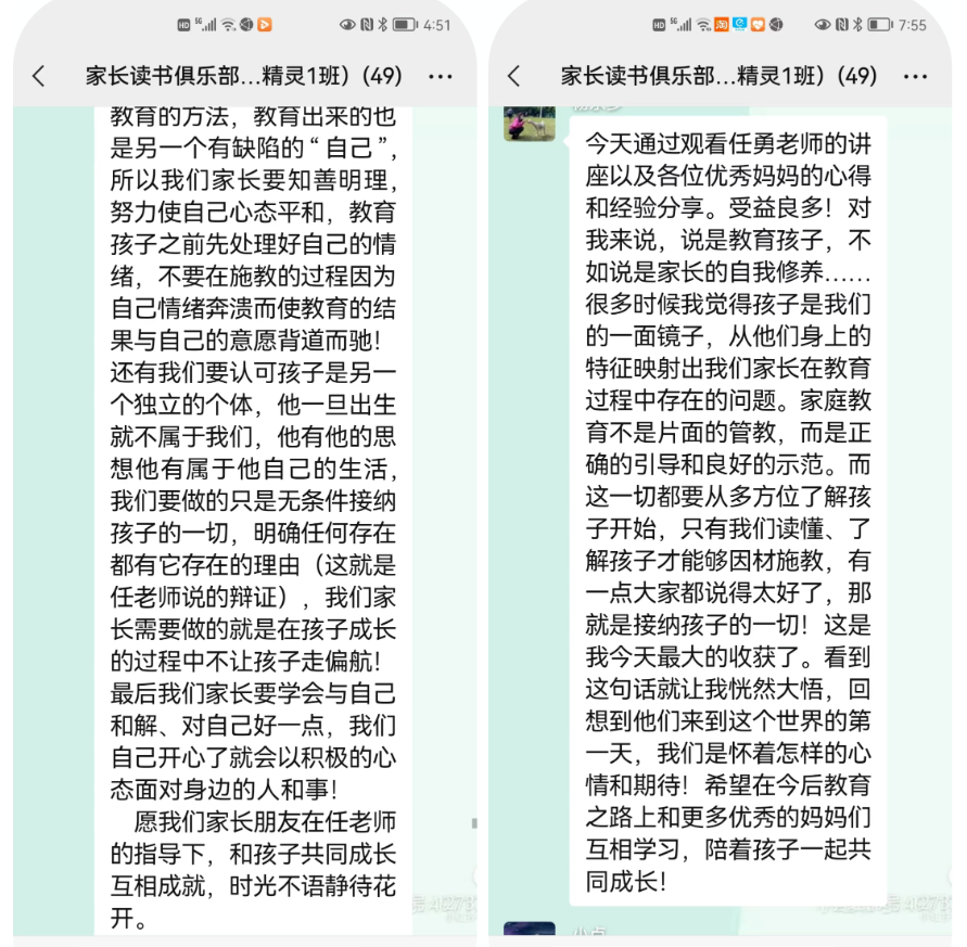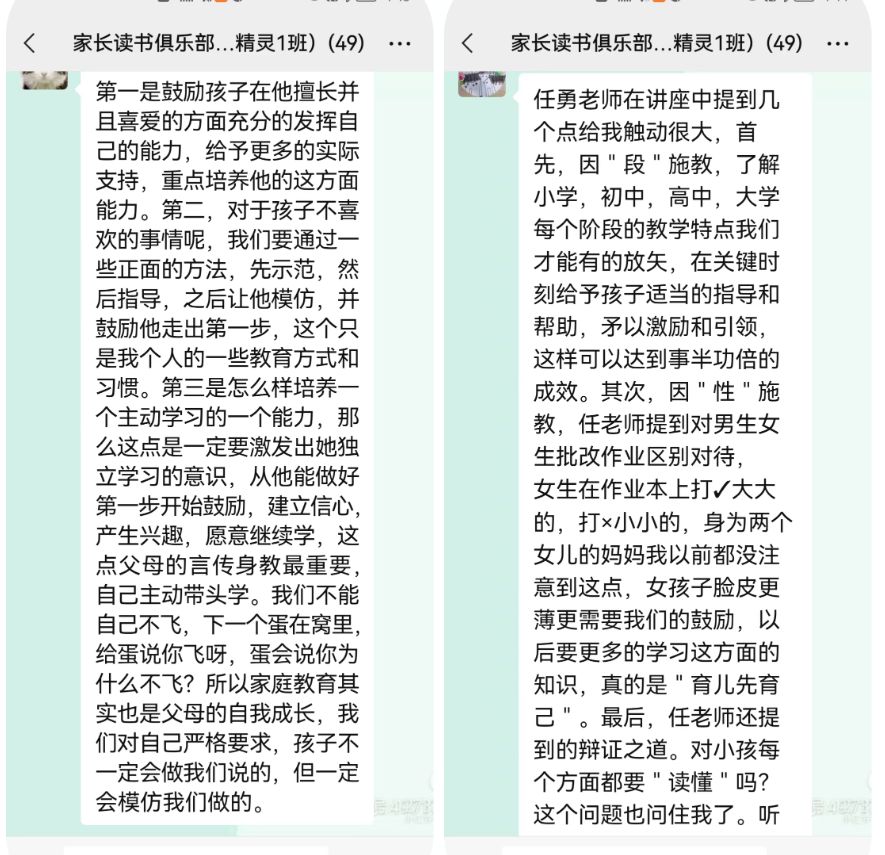 家长们分头利用劳动节假期认真学习任勇老师的讲座,并于5月4日回到班级家长读书俱乐部的微信群,在群内分享自己的感受和体会。家长们纷纷表示任勇老师的讲座令自己受益匪浅、茅塞顿开,很多家庭教育中遇到的困惑迎刃而解,大家都积极发言和讨论,相互交流的过程中彼此也碰撞出很多新想法。