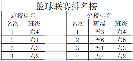 本次比赛总校六年级4支队伍,通过循环积分赛的方式,经过两周时间的对决,在紧张激烈的比赛中,运动员在场上挥洒汗水,为了班级荣誉拼尽全力,最终六4班获得本次篮球比赛的冠军。