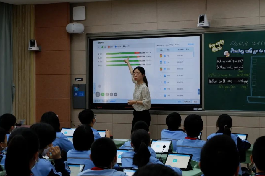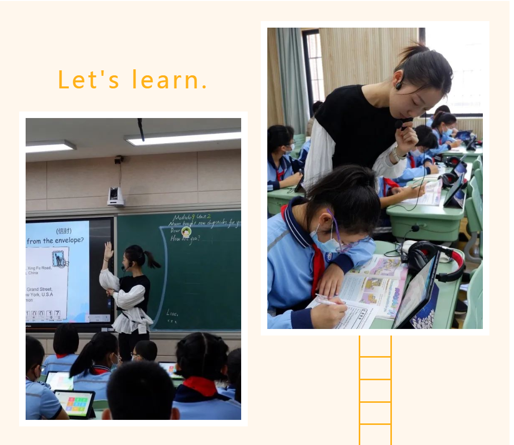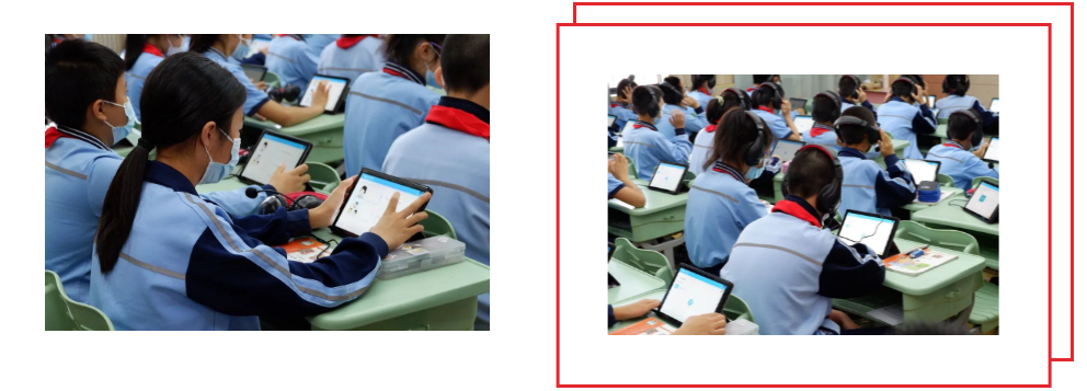 信息技术与课堂的深度融合能改变互动形式,丰富互动内容,加强互动深度。两位授课老师都尝试用电子书包来提升课堂效率。黄小闽老师通过电子书包推送听音跟读音频,让学生自主选择听音次数,做到可以反复听,反复读,实现学生个性化的学习。黄舒梅老师运用电子书包拍照上传学生作品,打破了传统课堂只能展示个别学生作品的局限性,让班上每个同学的作品都有机会在课上展示分享。