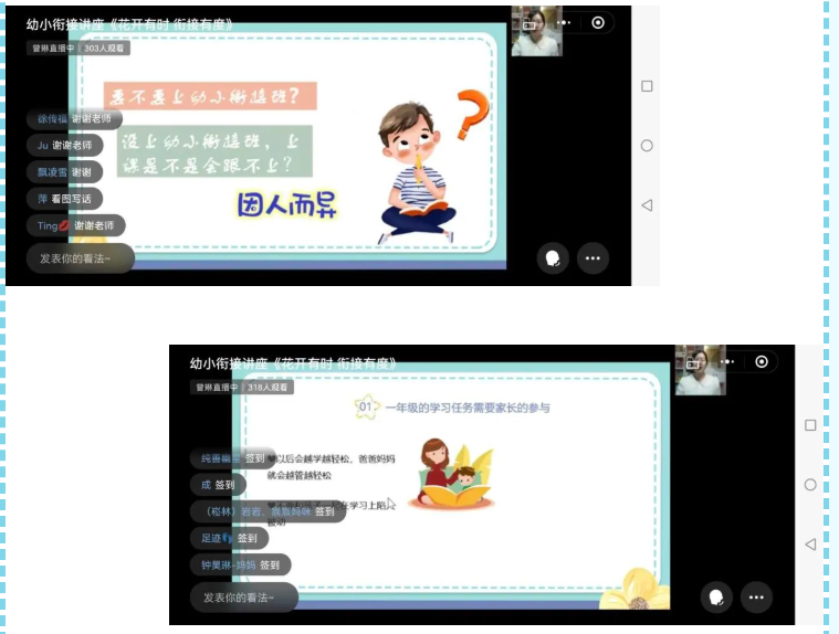 六所幼儿园三百多位家长参与了线上讲座的学习与互动提问。讲座过后,家长们纷纷表示收获满满,需要幼小衔接的不止是孩子,还有家长自己。