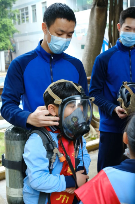 消防员哥哥们热情地邀请小雏鹰们试着背一背装备。背起氧气瓶的小朋友们纷纷都说“好重啊,原来消防员哥哥们这么辛苦”,敬佩之情油然而生!