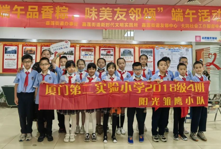 为更好地继承和弘扬中华优秀传统文化,了解和感受中华传统节日,2022年5月29日上午,厦门第二实验小学总校2018级4班阳光雏鹰小队来到嘉莲街道友邻中心,与社区居委会的爷爷奶奶们共同开展了“端午品香粽,味美友邻颂”端午民俗活动。