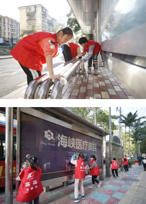 现场分成三个“雷锋小队”,以清洗三个公交站点分头践行“雷锋精神”。孩子们发扬“不怕苦、不怕累”的雷锋精神。有的负责擦公交站牌,有的擦洗公交站台,有的擦洗座椅,还有的擦洗灭烟柱……弯腰曲膝,为了未来的人类生活,付出劳动,真正践行“活着,就是为了让家园更美好”的精神!