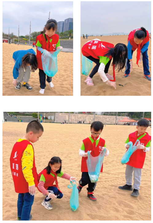孩子们在了解了海洋污染物的来源以及清理方法之后,开始行动起来,清洁沙滩,守卫这片美好家园。