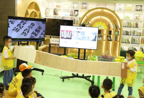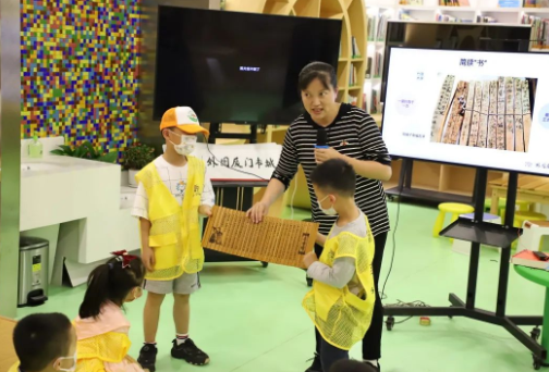 穿越时间的长河,中华五千年文明史的书籍演进画卷,在队员们的面前徐徐展开。夏商时期的甲骨文,揭开了文字起源的面纱;殷商时期的铜器铭文,拉开了书籍的序幕。“学富五车”的故事带领小队员们走进“竹木简书世界”。