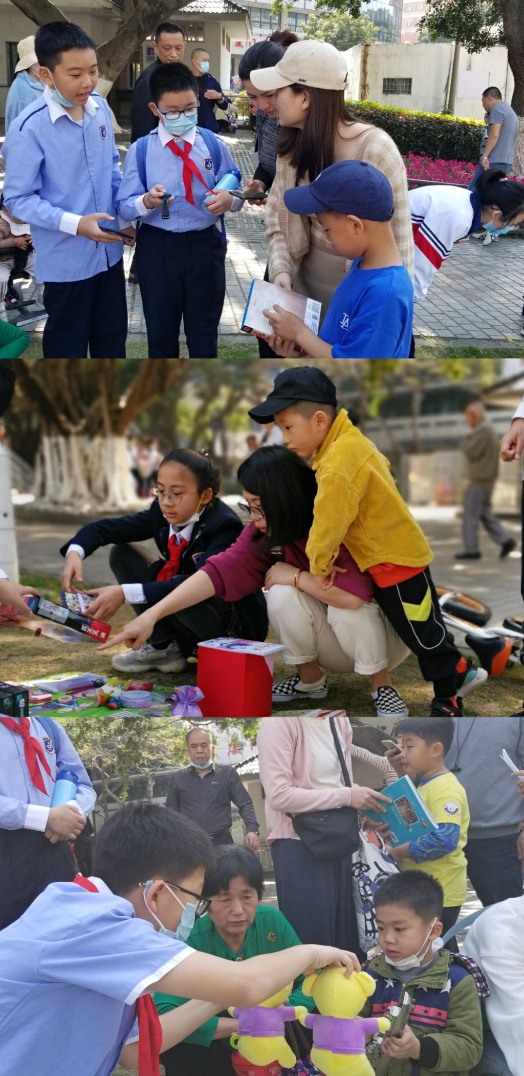 一开始,询问者寥寥,更谈不上“生意兴隆”,但同学们都不气馁,对往来行人大胆地进行了“推销”,卖力地叫卖自己珍藏的各种“宝贝”,摊位逐渐变得热闹起来。同学们特别热情:“阿姨,这本书是三年级推荐课外书目,只卖5元,您买吗?”……同学们有的流利地介绍着书籍的内容,有的熟练地展示着玩具的功能。路人们得知同学们的义卖活动是为了给自闭症儿童献爱心,纷纷慷慨解囊,献出了自己的一片爱心。下至两三岁的小朋友,上至七八十岁的老爷爷、老奶奶都来“捧场”,一时间,同学们竟然都有些忙不过来了!